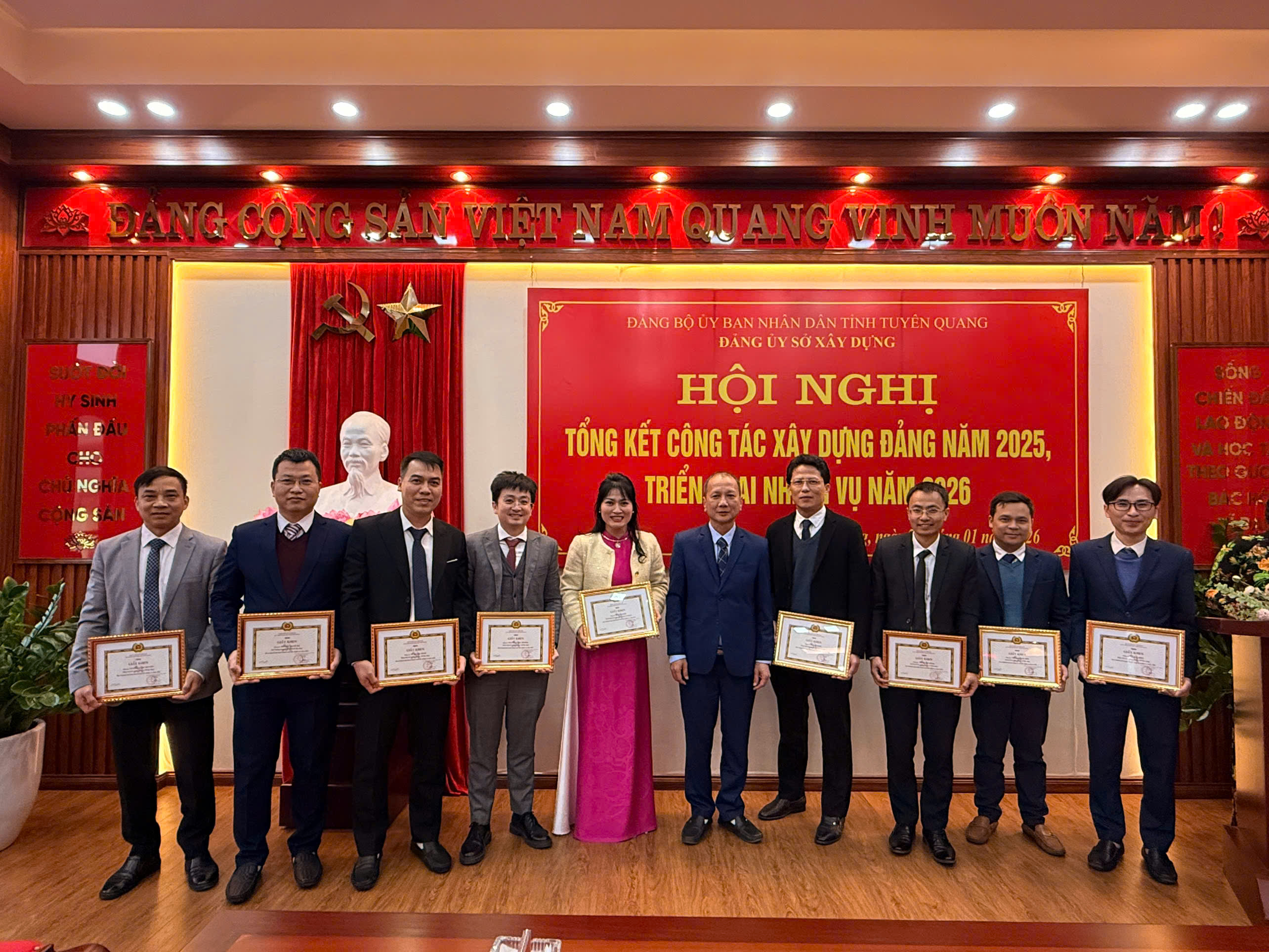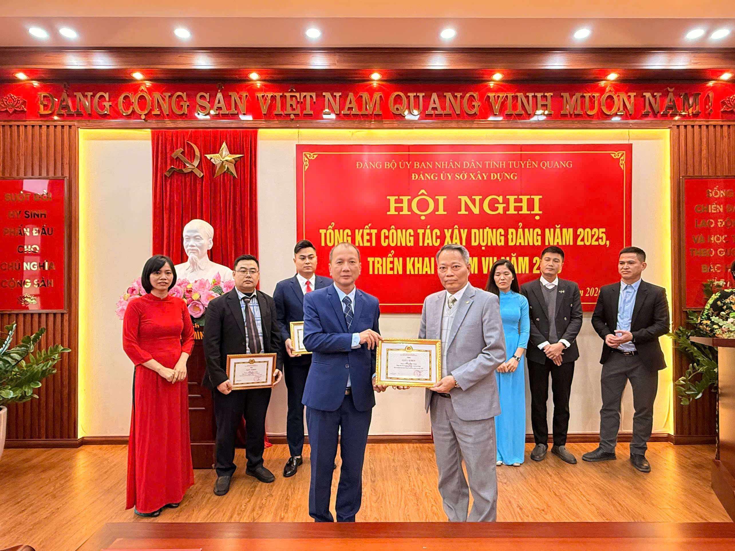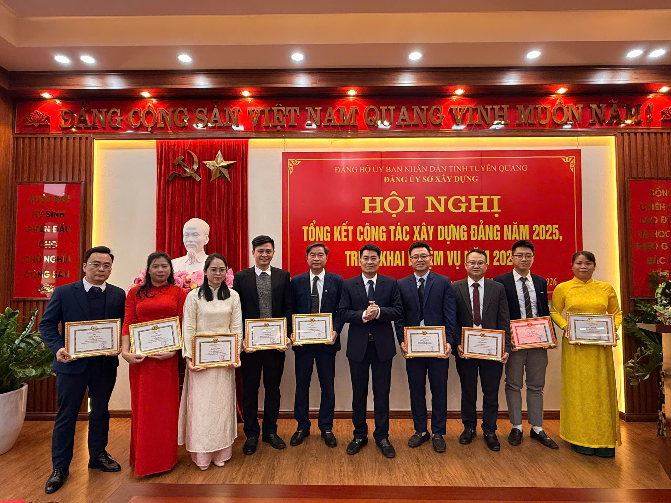 Đặc biệt, công tác giáo dục chính trị, tư tưởng, tuyên truyền được chú trọng và thực hiện tốt. Đảng ủy, lãnh đạo Sở xác định đây là nhiệm vụ then chốt để đảm bảo thành công của việc sáp nhập. Sở đã tổ chức quán triệt sâu sắc các chủ trương, nghị quyết của Đảng, Nhà nước về sắp xếp đơn vị hành chính đến 100% cán bộ, đảng viên, công chức, viên chức và người lao động. Qua đó, tạo sự đồng thuận cao, yên tâm công tác, củng cố khối đoàn kết nội bộ; xây dựng môi trường làm việc kỷ cương, trách nhiệm, văn hóa và chuyên nghiệp trong “ngôi nhà chung” Sở Xây dựng Tuyên Quang. Trong năm 2025, thực hiện Quyết định số 09/2025/QĐ-UBND của UBND tỉnh về quy định chức năng, nhiệm vụ, quyền hạn và cơ cấu tổ chức của Sở Xây dựng; Quyết định số 17-QĐ/ĐU về thành lập Đảng bộ Sở Xây dựng, tập thể lãnh đạo Sở đã nhanh chóng ổn định tổ chức, ban hành Quy chế làm việc, Quy chế chi tiêu nội bộ và phân công nhiệm vụ cụ thể cho các phòng, ban, đơn vị trực thuộc. Toàn ngành đã nghiêm túc thực hiện các quy định của Đảng, pháp luật của Nhà nước, làm việc với tinh thần trách nhiệm cao, cam kết không để xảy ra tình trạng nhũng nhiễu, tiêu cực trong giải quyết thủ tục hành chính về xây dựng, quy hoạch và quản lý nhà ở.